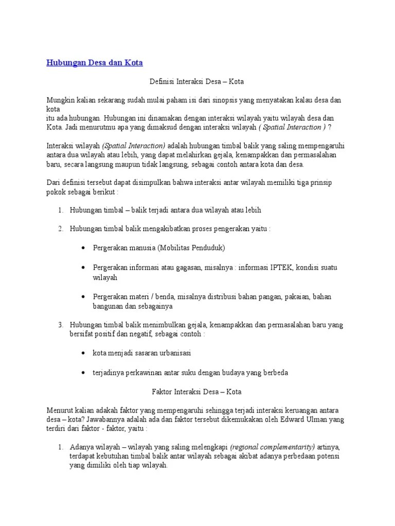 Interaksi antara desa dan kota terjadi karena berbagai faktor atau unsur yang ada dalam desa, kota dan diantara desa dan kota. 3) zona di sepanjang jalur lalu lintas angkutan berat (heavy freight traffic). 2) zona di dekat daerah perdagangan (trade districts). Nah baru nih, kalo interaksinya antara desa dan kota pasti menimbulkan perubahan yang signifikan pada desa dan kota yang terlibat. Zona ini muncul dari hasil interaksi desa dan kota.
